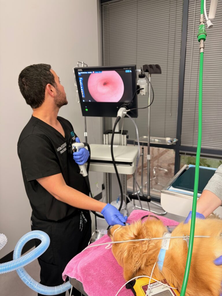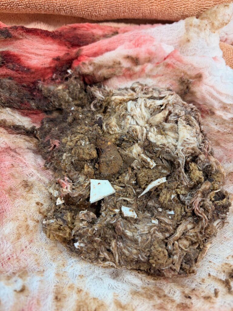 She was sent for esophagoscopy with Dr. Gibson to ensure her esophagus was not cut as she swallowed the broken glass. Surgery to remove the fragments was then recommended (the material could not be scoped out due to volume, as well as possible injury to the esophagus if it was removed back out with a scope). She went straight from her scope into surgery, where a gastrotomy was performed to remove all the chewed-up chicken pieces and chunks of white broken plate. The glass pieces were close to the size of her intestine, so we don’t know if they would have passed through her food without cutting through her intestines on the way out (if they weren’t removed during surgery). She recovered very well from surgery and was sent home the following day, eating well!