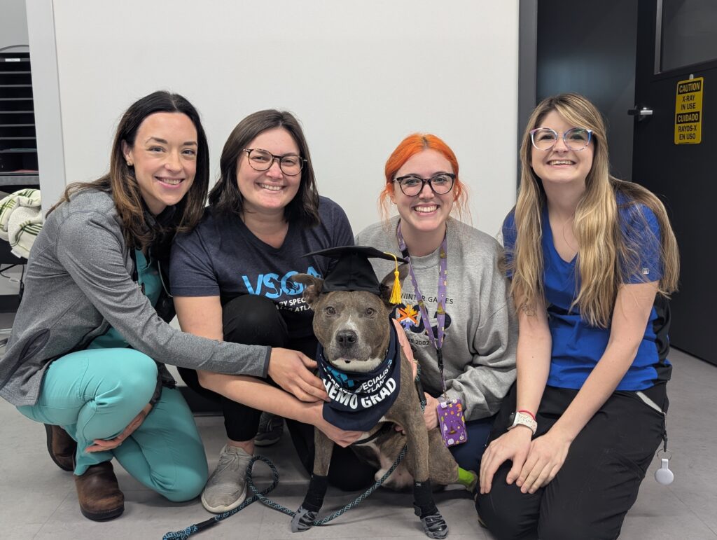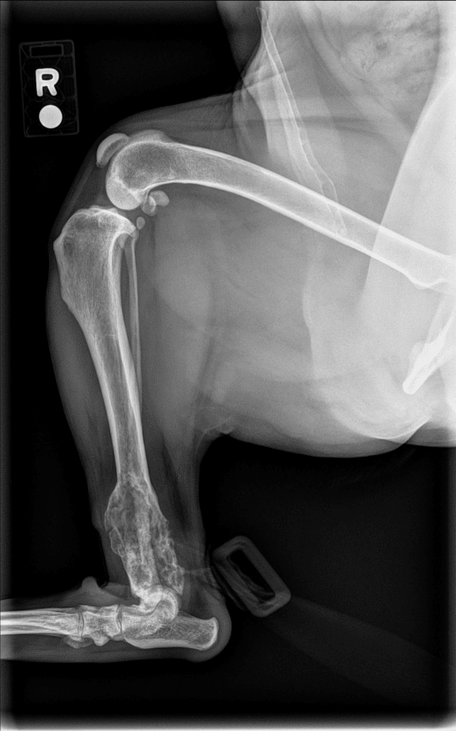 Kodak was seen by Dr. Cross on December 4th for a right hindlimb lameness, and he was diagnosed with a right distal tibial bone tumor. His chest radiographs were normal. Dr. MacDougall did a hind limb amputation on December 8th, and he recovered beautifully. He started chemotherapy with Dr. Cletzer in early January, and has now graduated from treatment! He will be rechecked every 3 months for a physical exam and chest radiographs, but has done so well for all his treatment! He is the sweetest Pittie boy!