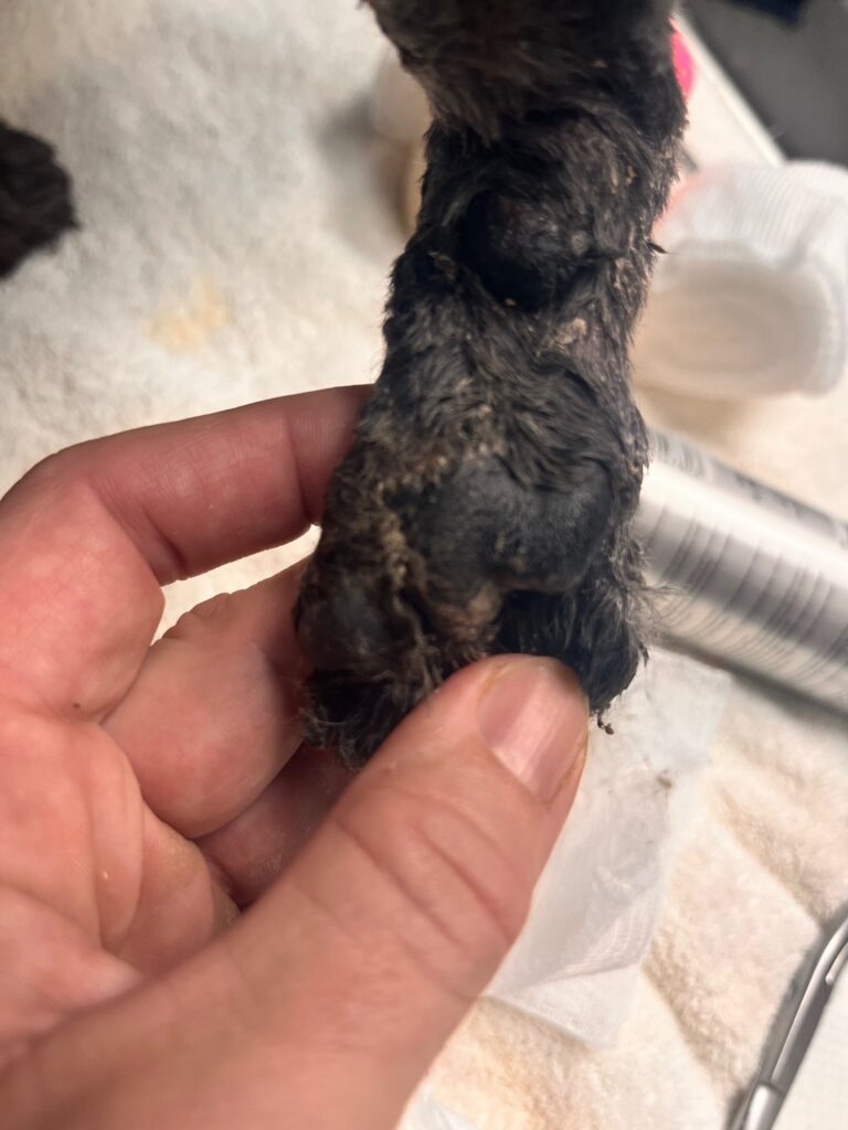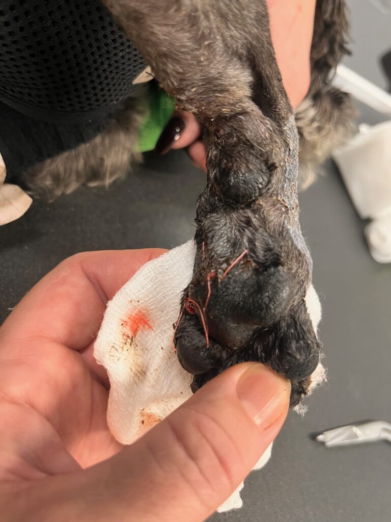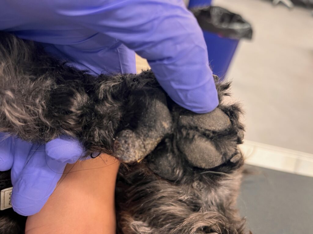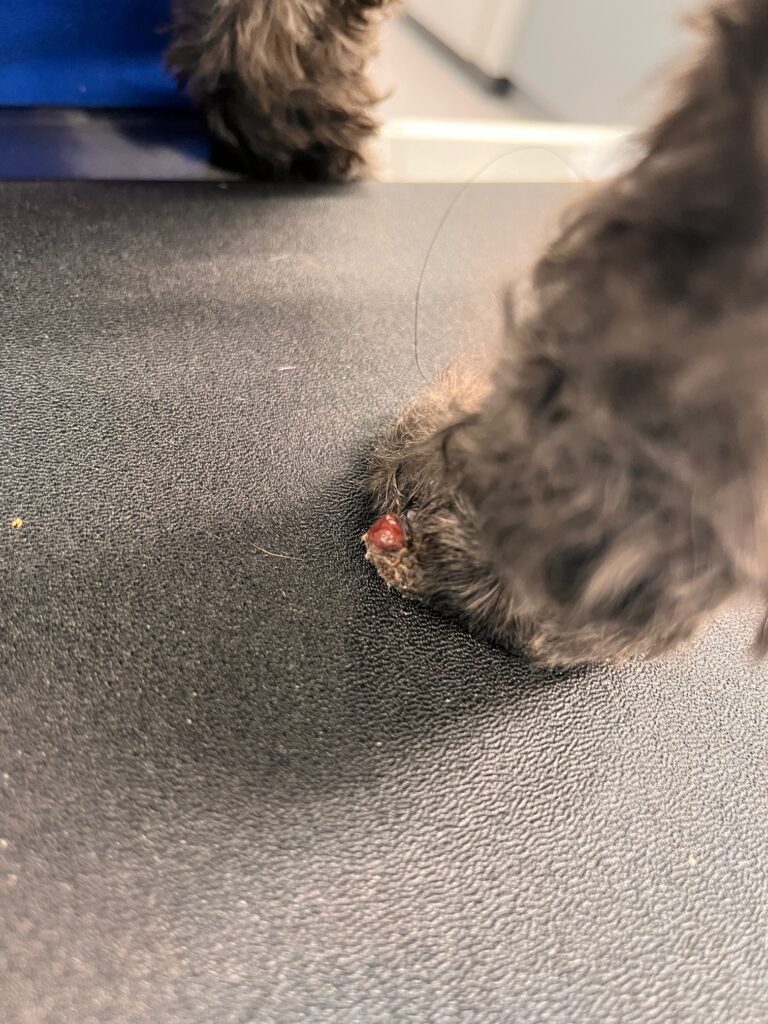 Oscar Clarke is a 14-year-old MC Schnauzer cross that presented for a melanoma on the metacarpal pad of his right front limb. This is the large meaty pad above the toes.